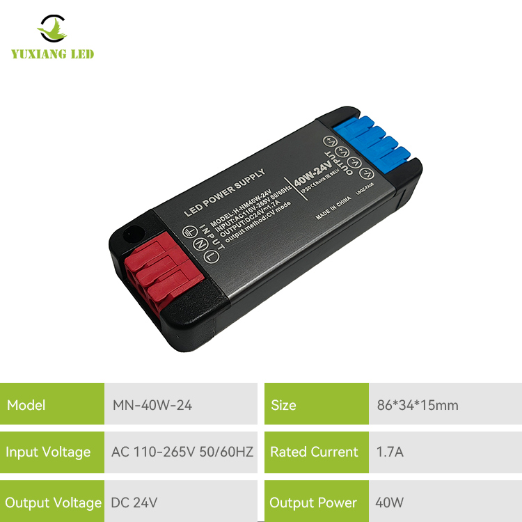 1、Guangzhou Yuxiangs hochwertiges 24V 40W Weitspannungs-Mini-LED-Ultradünnes-Gleichstromnetzteil verfügt über ein Gehäuse aus hochdichter Aluminiumlegierung und hochwertige Druckknopfanschlüsse für eine einfache Verkabelung, was die Installationseffizienz erheblich verbessert und die Verwendung für Anfänger erleichtert.